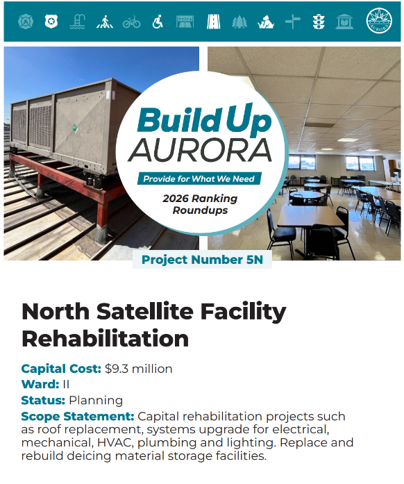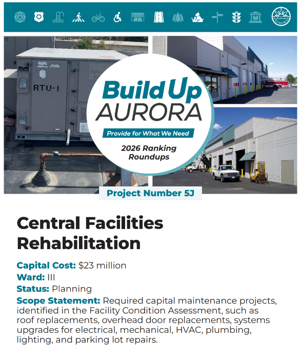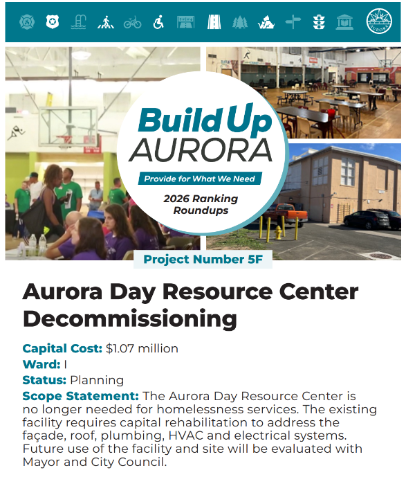 Please review and reflect on these capital projects shown below, pick the top five you think should be prioritized for Build Up Aurora, and then rank order your top five from most prioritized to least (1 = most prioritized to 5 = least prioritized)