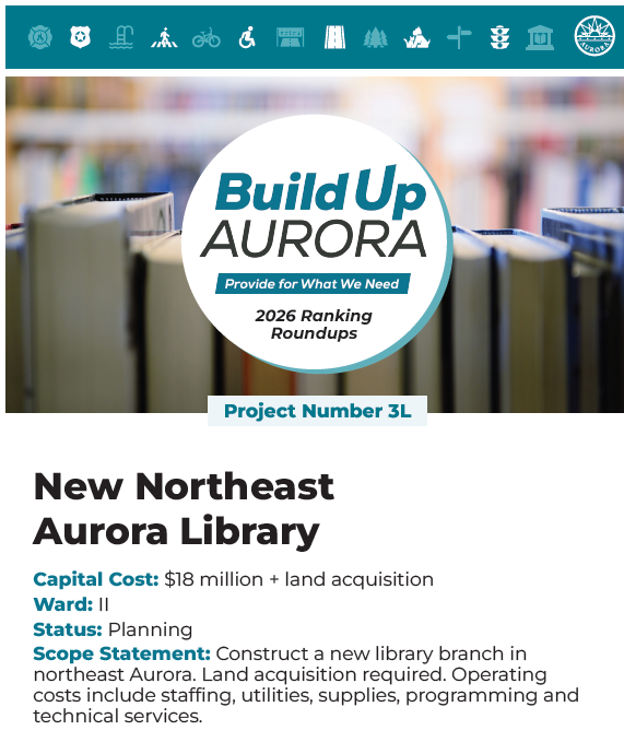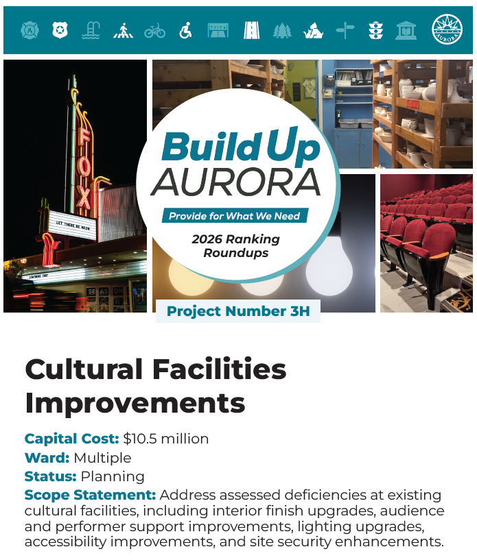 Please review and reflect on these capital projects shown below, pick the top five you think should be prioritized for Build Up Aurora, and then rank order your top five from most prioritized to least (1 = most prioritized to 5 = least prioritized)
